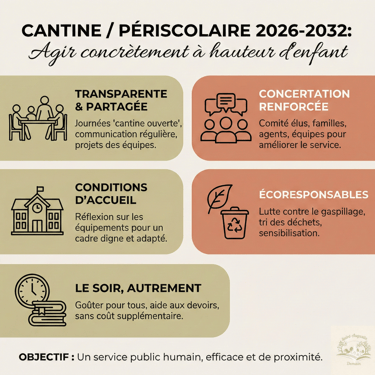 Nous souhaitons également renforcer la concertation, en associant élus, familles, agents et équipes éducatives au sein d'un comité cantine et périscolaire, pour améliorer en continu l'organisation et la qualité du service.