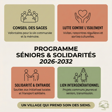 👉 Notre ambition : un village où l’on ne laisse personne de côté, où la solidarité se vit au quotidien, simplement et sincèrement. Prendre soin des aînés, c’est prendre soin de toute la commune. Leur expérience, leur mémoire et leur engagement sont une richesse précieuse pour notre village. Pour 2026-2032, nous faisons le choix d’un village attentif, solidaire et profondément humain, où chacun a sa place, à chaque étape de la vie.